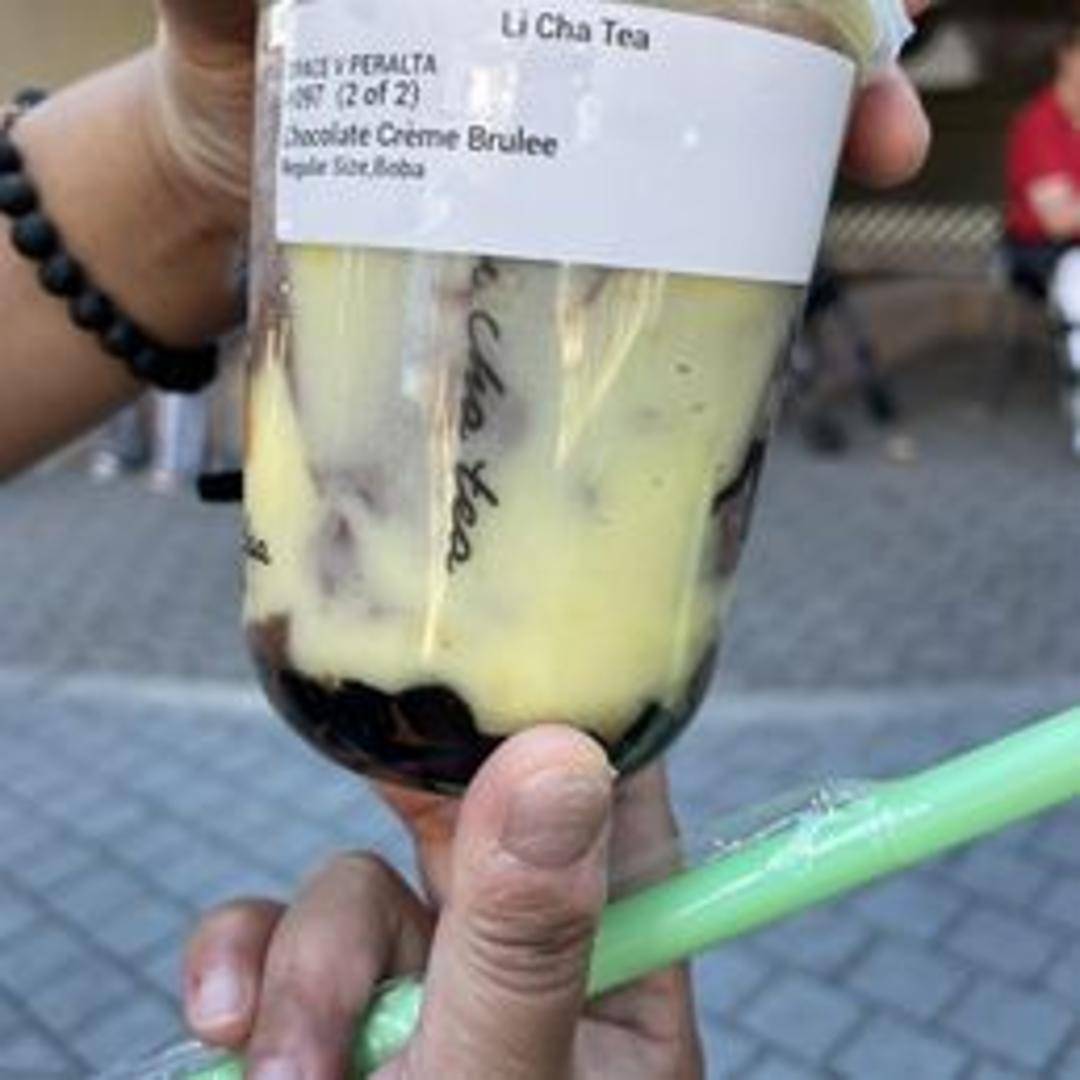 A decadent milk tea featuring a rich chocolate base swirled with a creamy creme brulee flavor. This drink offers a luxurious blend of chocolate and caramelized sugar notes, creating a sweet and indulgent treat with a visually appealing marble effect.