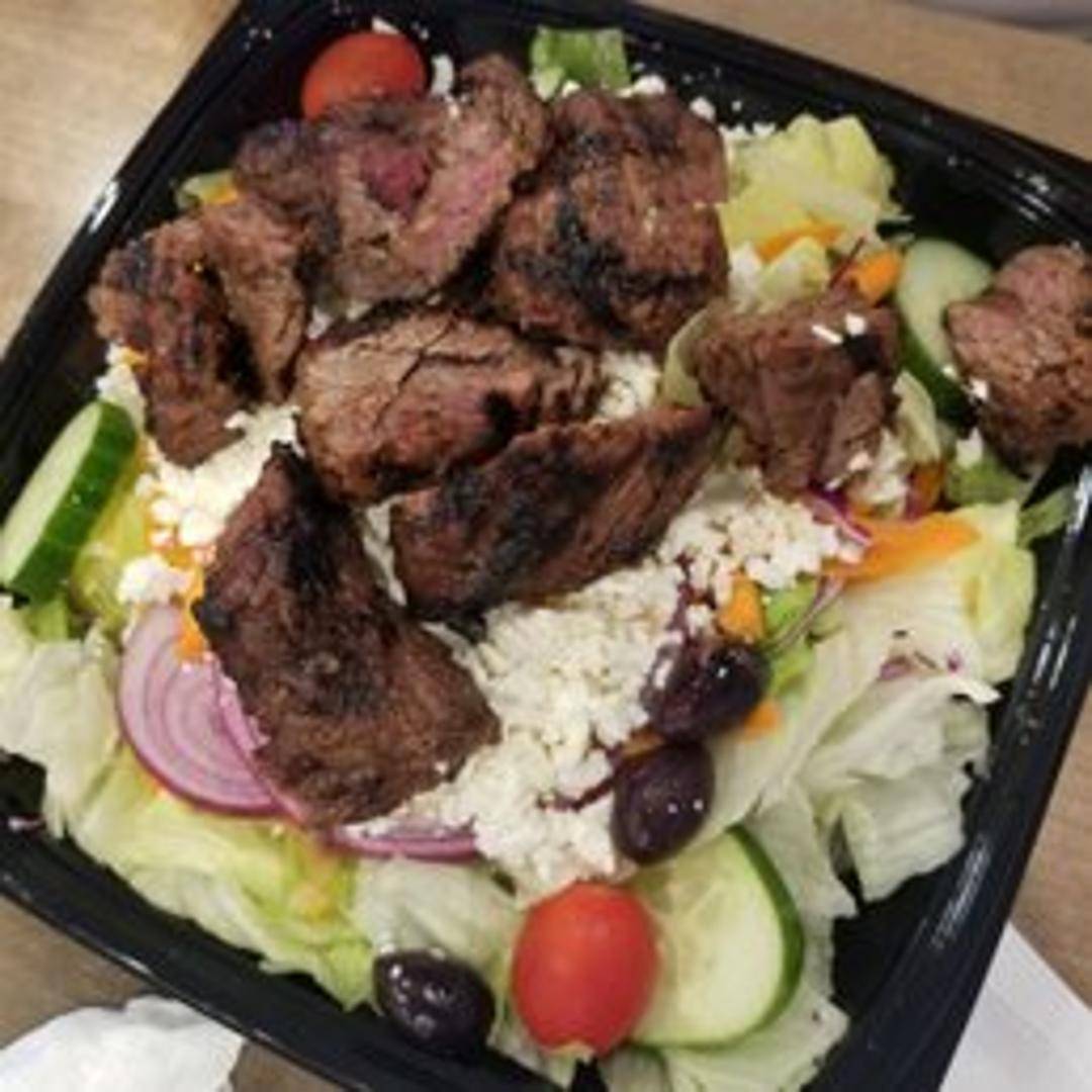 A refreshing salad featuring crisp lettuce, tomatoes, cucumbers, onions, Kalamata olives, and feta cheese, tossed in a Greek vinaigrette dressing.