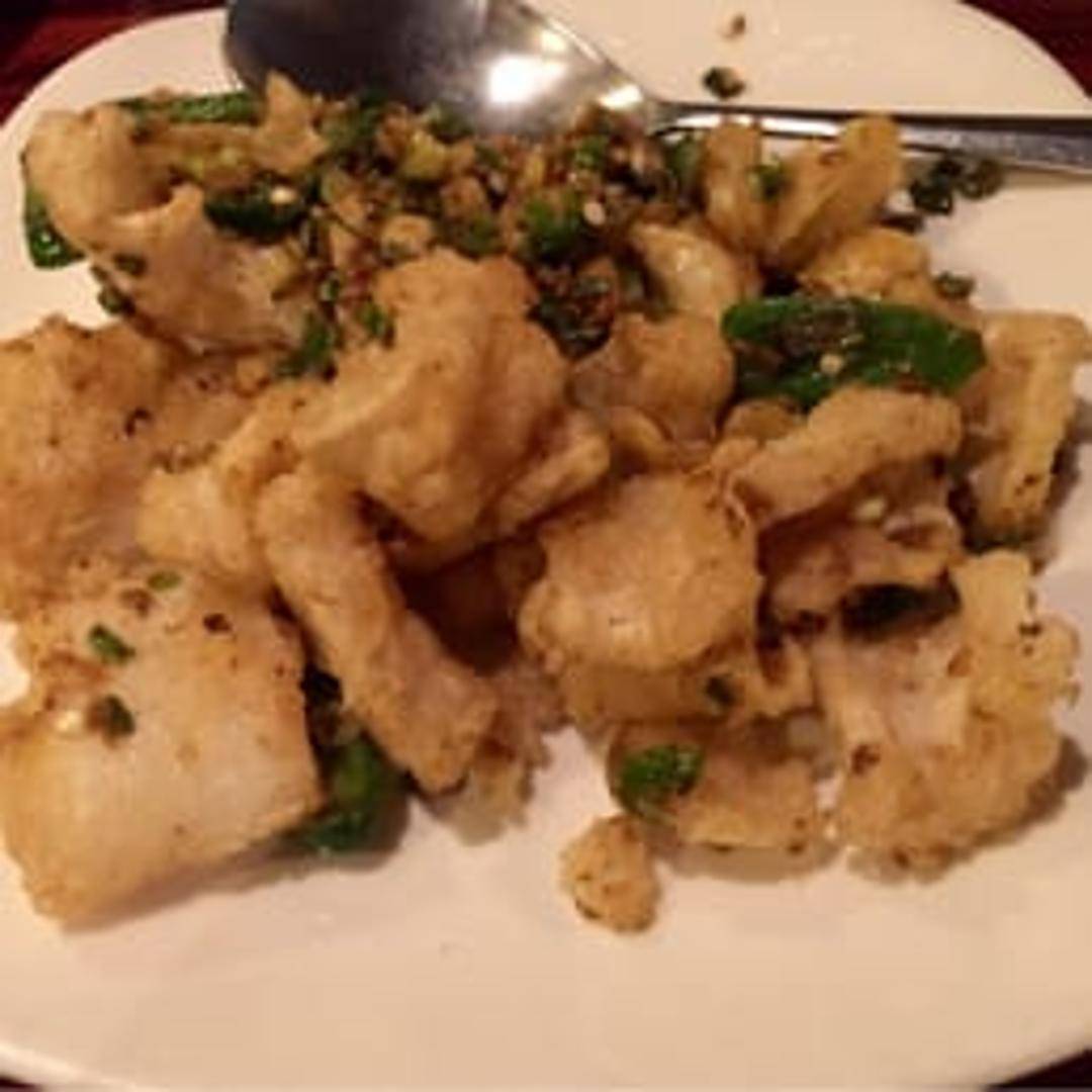 Lightly battered and fried calamari seasoned with a blend of salt, pepper, and spices. Often garnished with green onions and served with a dipping sauce.