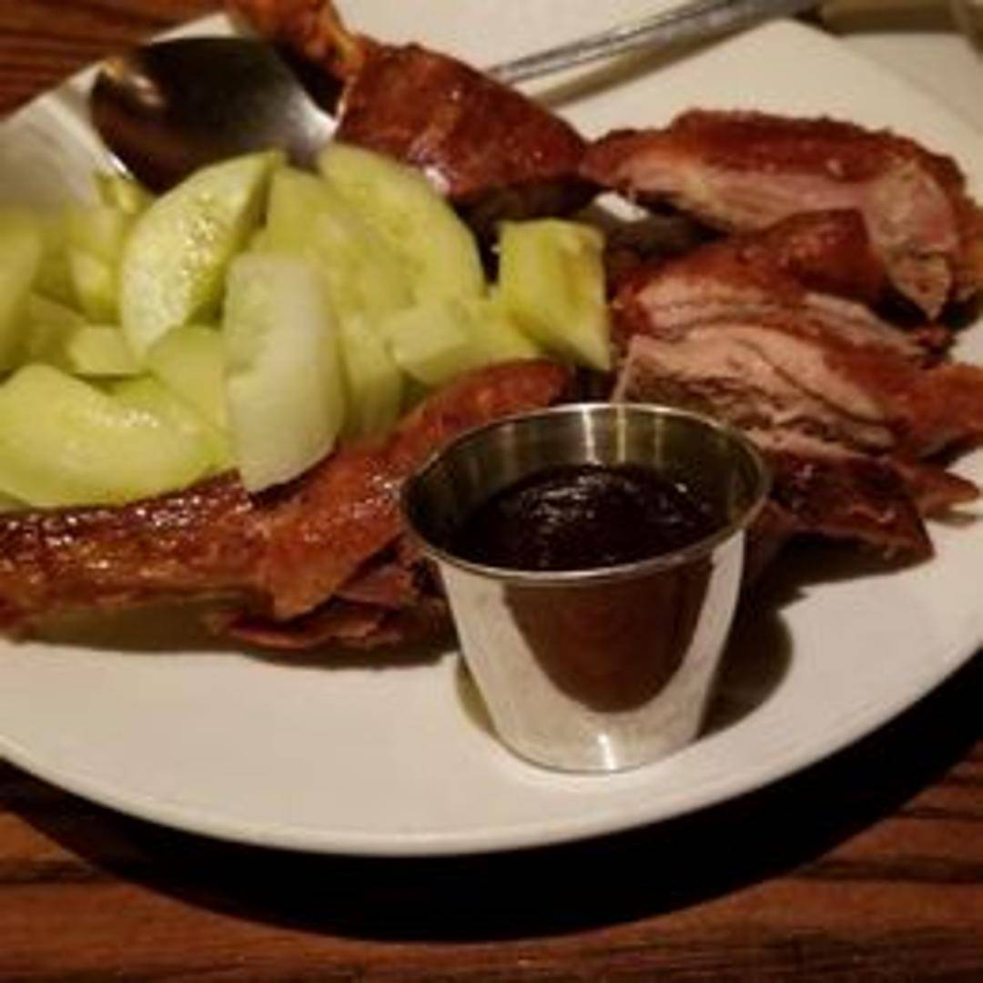 A whole duck, marinated in traditional Cantonese spices and roasted to crispy perfection. The skin is exceptionally crisp and the meat is tender and flavorful. Served with scallions, cucumbers, and thin pancakes for wrapping, along with a rich hoisin sauce.