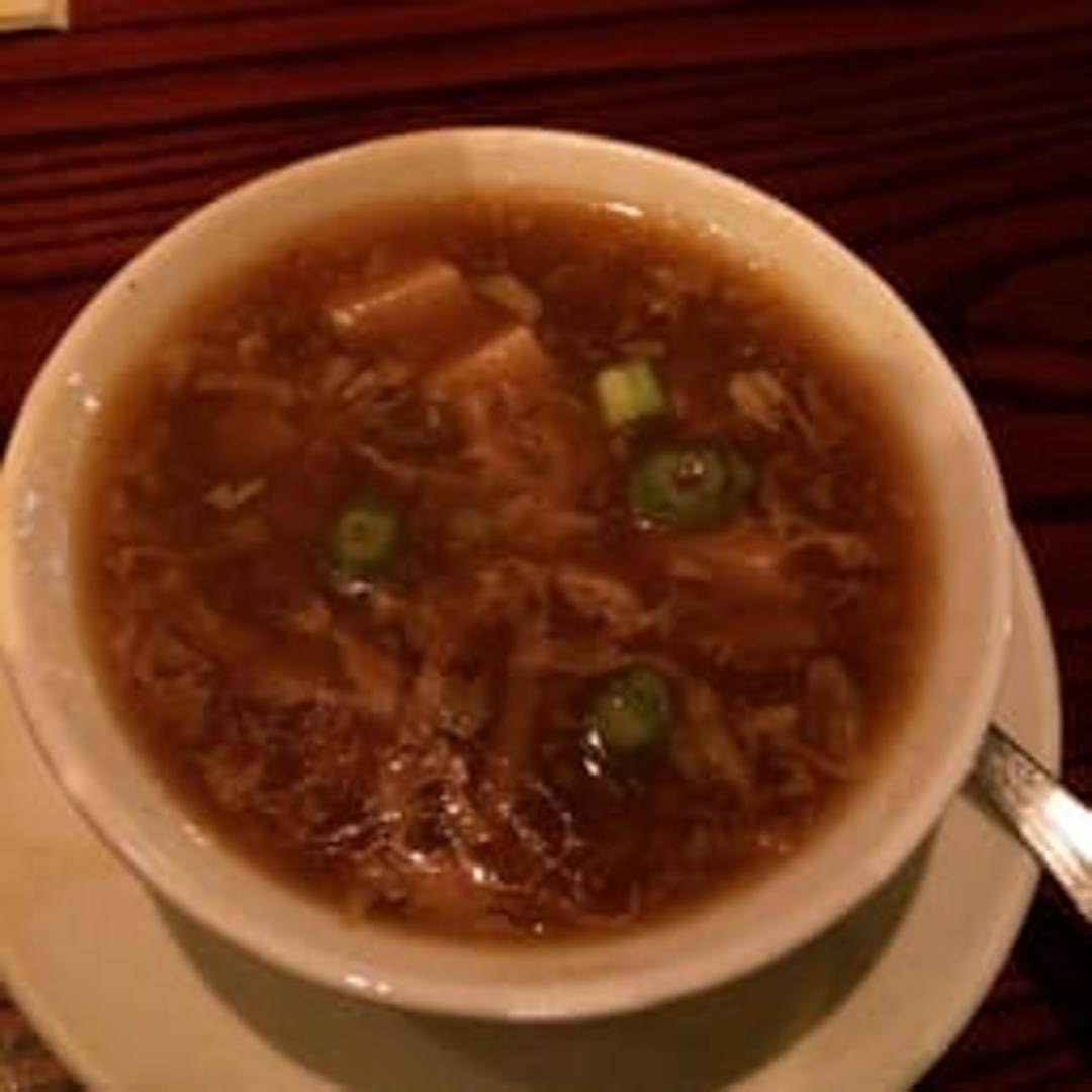 A flavorful and tangy soup with a spicy kick. Contains tofu, mushrooms, bamboo shoots, wood ear mushrooms, and egg drops in a rich, thickened broth.