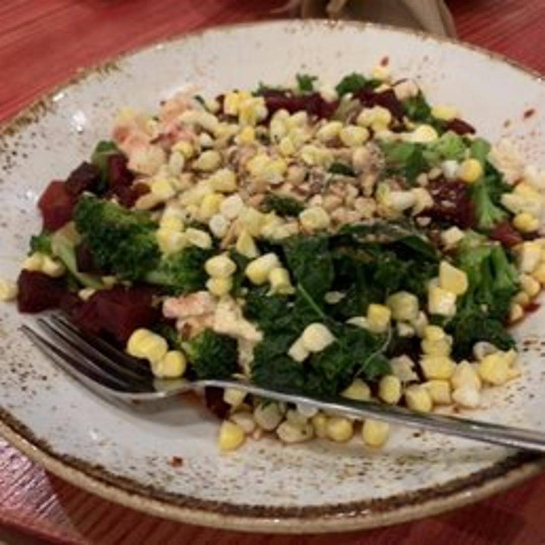 Brown rice, adzuki beans, steamed greens, carrots, beets, sprouts, sea vegetables, toasted pumpkin seeds, and a ginger sesame sauce.