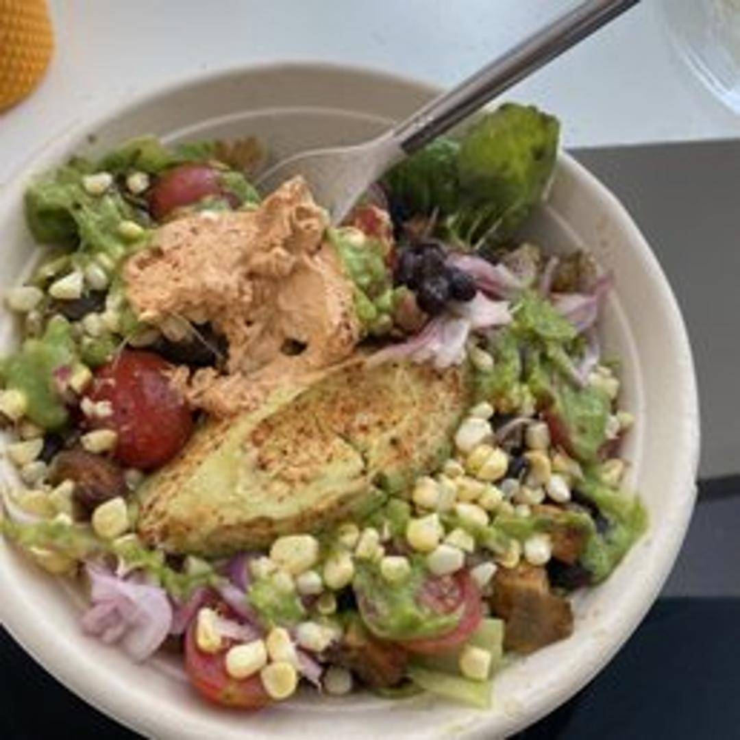 Organic mixed greens, grilled corn, avocado, black beans, red onion, cilantro, queso fresco, lime wedge, and chipotle-lime dressing.