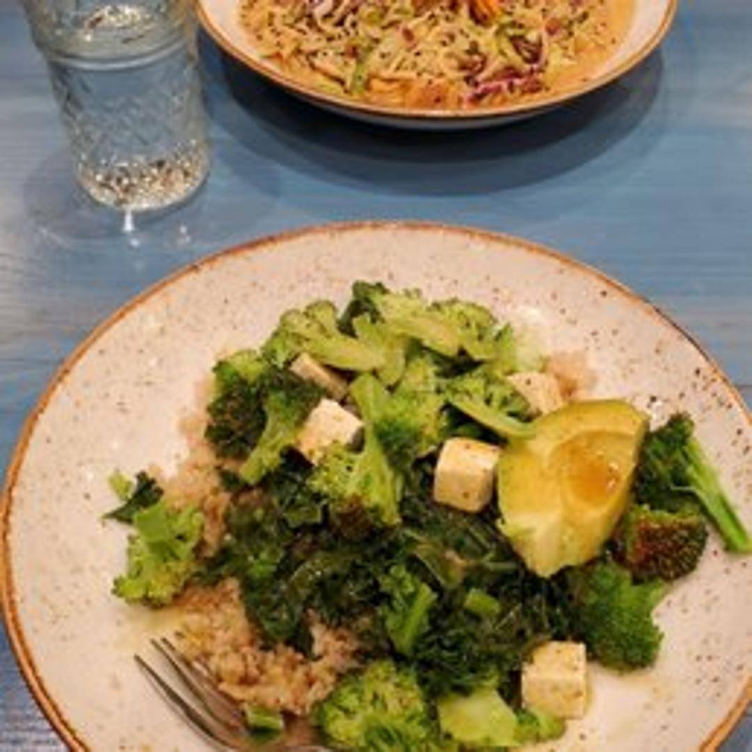 Brown rice noodles, shredded carrots, cabbage, sprouts, peanuts, and a creamy Thai peanut sauce.