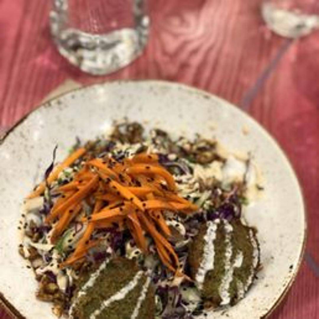 Organic mixed greens, shredded carrots, pickled daikon radish and carrots, cucumber, cilantro, jalapenos, choice of protein (organic tofu or tempeh), and a sweet and tangy peanut dressing.