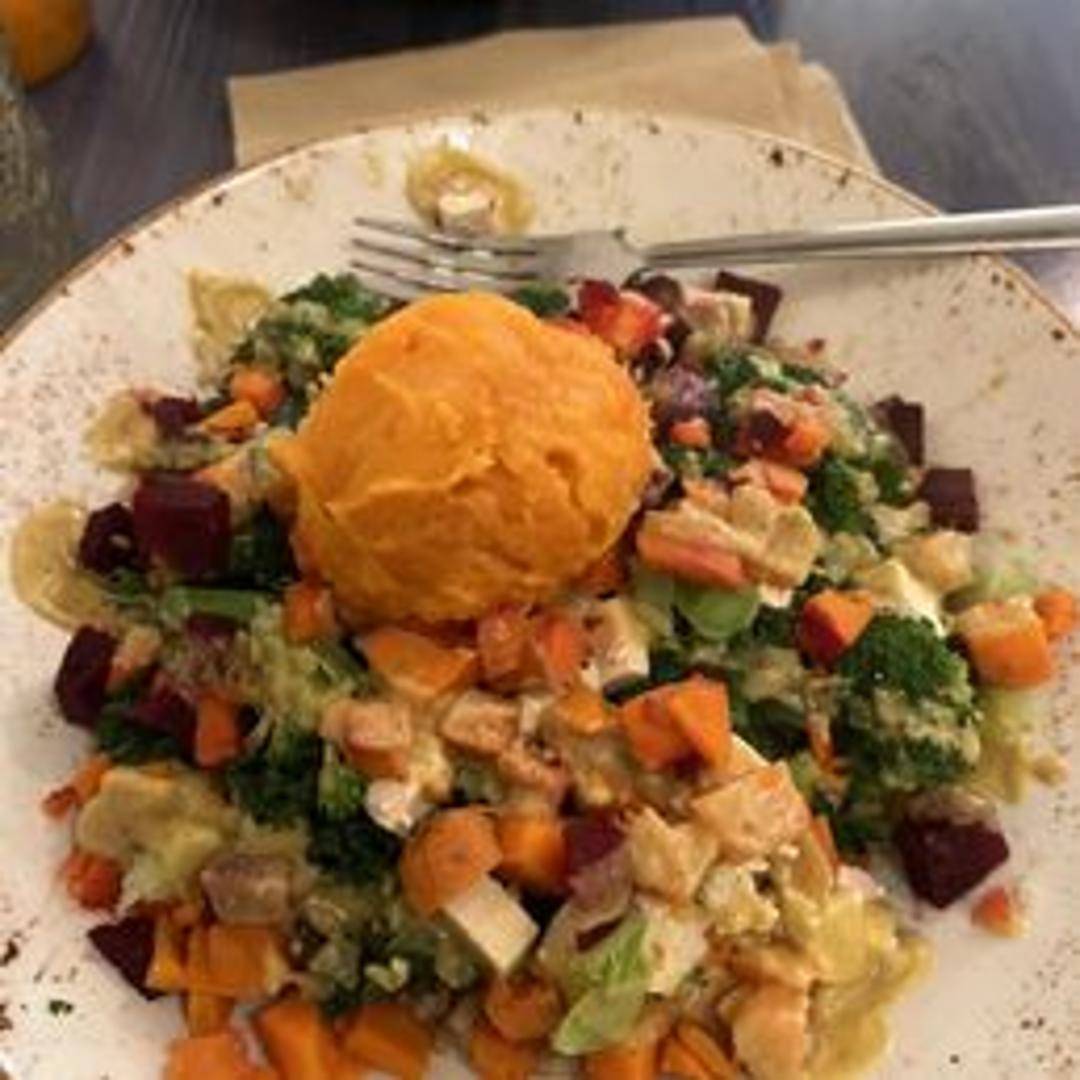 A vibrant and nourishing bowl featuring a medley of colorful vegetables like beets, carrots, and cabbage, paired with sprouted grains or quinoa, seeds, and a flavorful dressing. A complete and balanced meal for sustained energy.