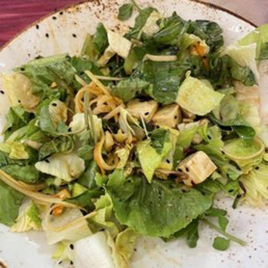 A flavorful and satisfying bowl featuring seasoned tofu, brown rice, shredded carrots, beets, sprouts, and a creamy sesame ginger dressing.