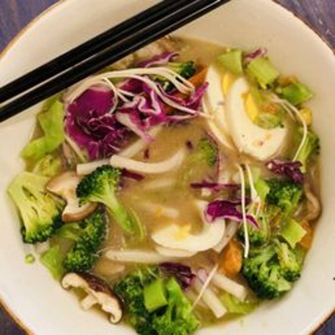 A warm and comforting noodle dish with udon noodles, shiitake mushrooms, scallions, bok choy, nori, and a savory broth.