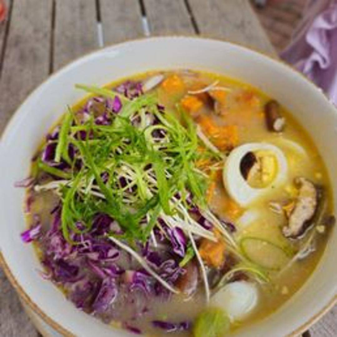 A comforting and savory noodle soup with thick, chewy udon noodles in a flavorful broth. Highlighted by earthy shiitake mushrooms, this dish often includes other ingredients like scallions, nori seaweed, and tofu for added texture and nutrition. The broth is typically a dashi-based broth, providing a umami-rich flavor.