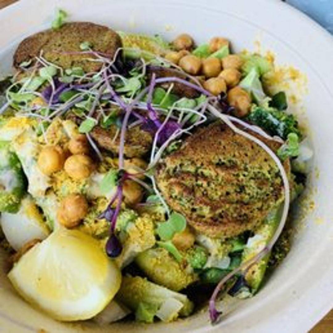 A vibrant and refreshing falafel bowl bursting with seasonal spring flavors. Features house-made falafel, fresh greens, sprouts, shredded carrots, cucumbers, pickled onions, creamy tahini dressing, and a sprinkle of sesame seeds.