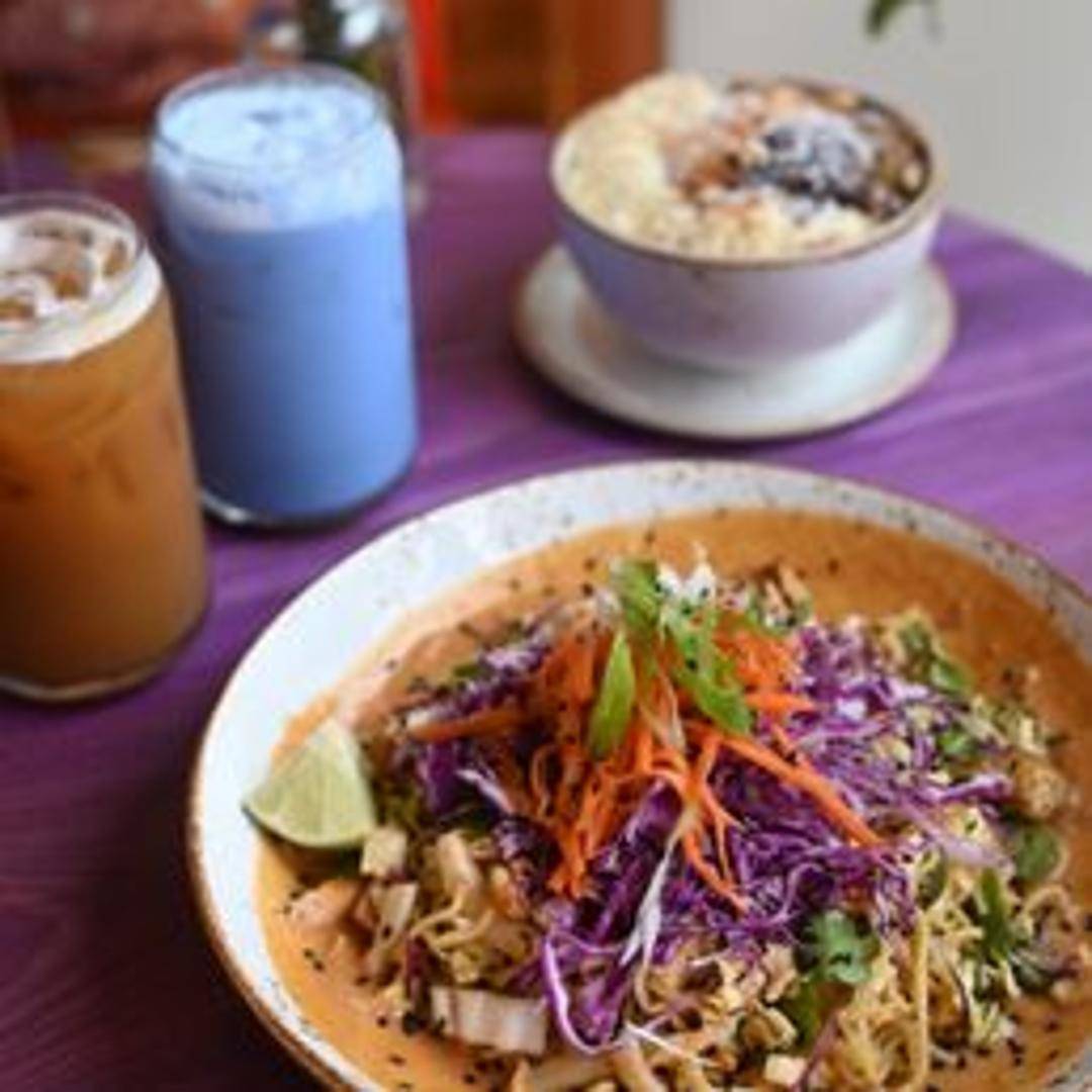 A flavorful noodle dish with a spicy peanut sauce. It includes noodles, typically rice noodles, tossed with a peanut-based sauce that incorporates chili and other spices for heat. Often includes vegetables like carrots, cabbage, and scallions and can be topped with peanuts or sesame seeds.