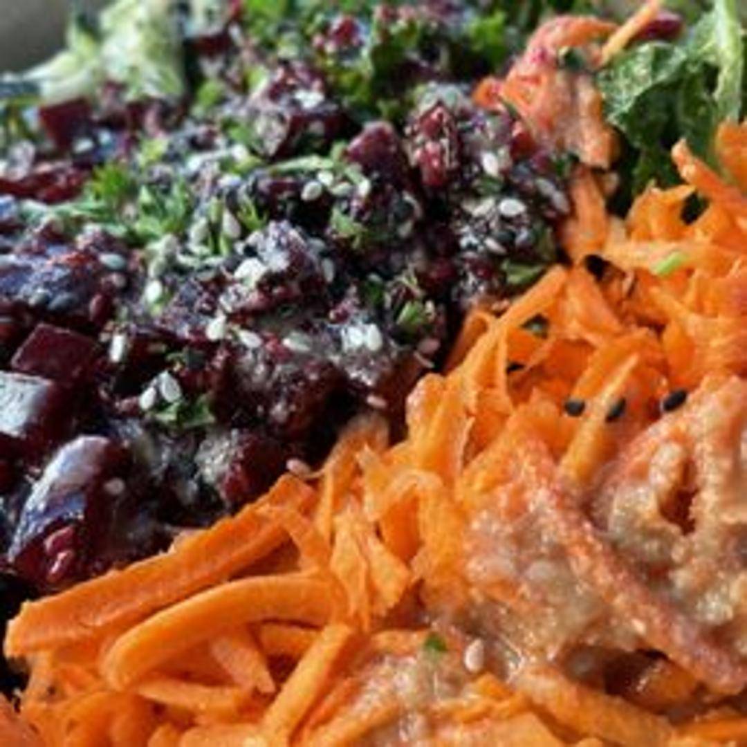 A vibrant and refreshing bowl featuring marinated beet "ahi", a colorful mix of fresh vegetables, seaweed salad, avocado, edamame, and sesame seeds. Served over a bed of sushi rice and drizzled with a flavorful poke sauce. A delicious and plant-based twist on a classic Hawaiian favorite.
