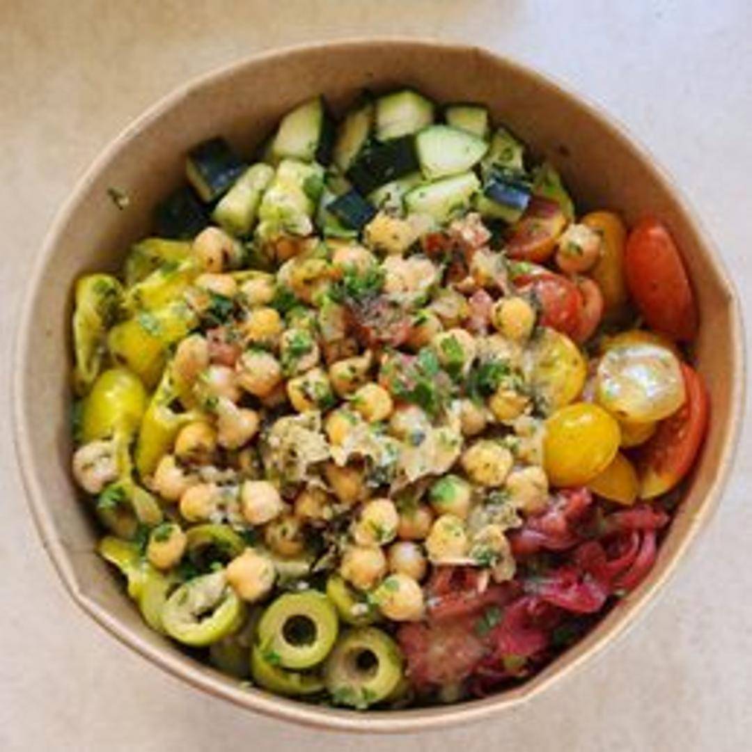 A vibrant and flavorful salad featuring marinated artichoke hearts, olives, roasted red peppers, sun-dried tomatoes, and a tangy Italian vinaigrette dressing. A medley of Mediterranean flavors perfect as a light meal or side dish.