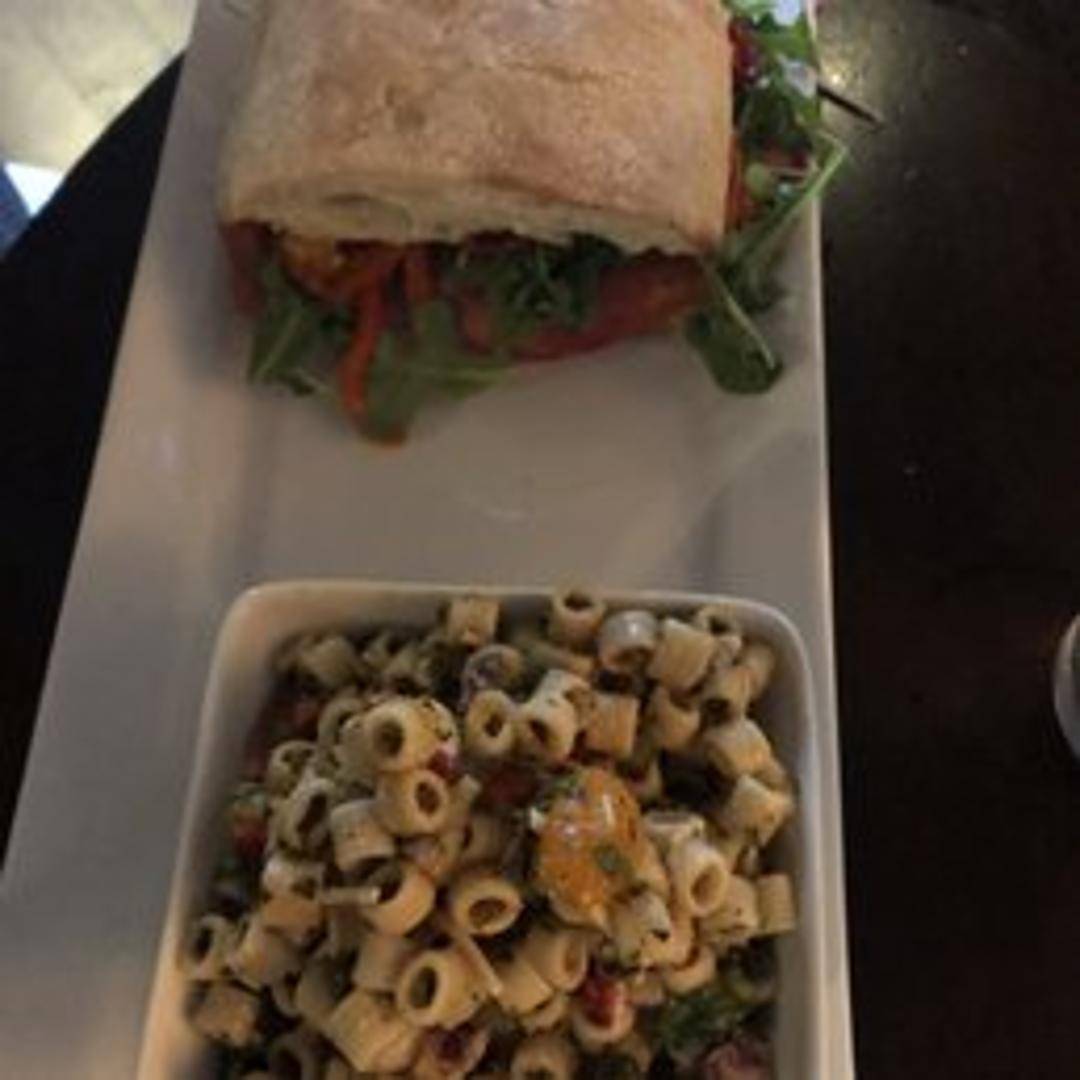 A refreshing and vibrant salad featuring perfectly cooked pasta tossed with a medley of fresh vegetables, herbs, and a tangy vinaigrette dressing. May contain ingredients such as bell peppers, cucumbers, tomatoes, olives, red onion, and Italian dressing.