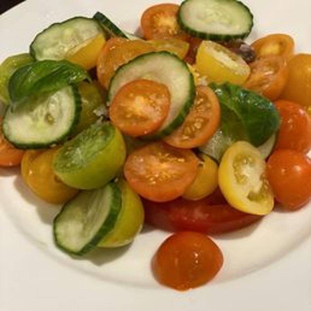 A refreshing salad featuring crisp cucumbers and juicy tomatoes, likely tossed with a light vinaigrette and perhaps fresh herbs like basil or dill. May include red onion for a bit of bite. A simple and flavorful side or light meal option.
