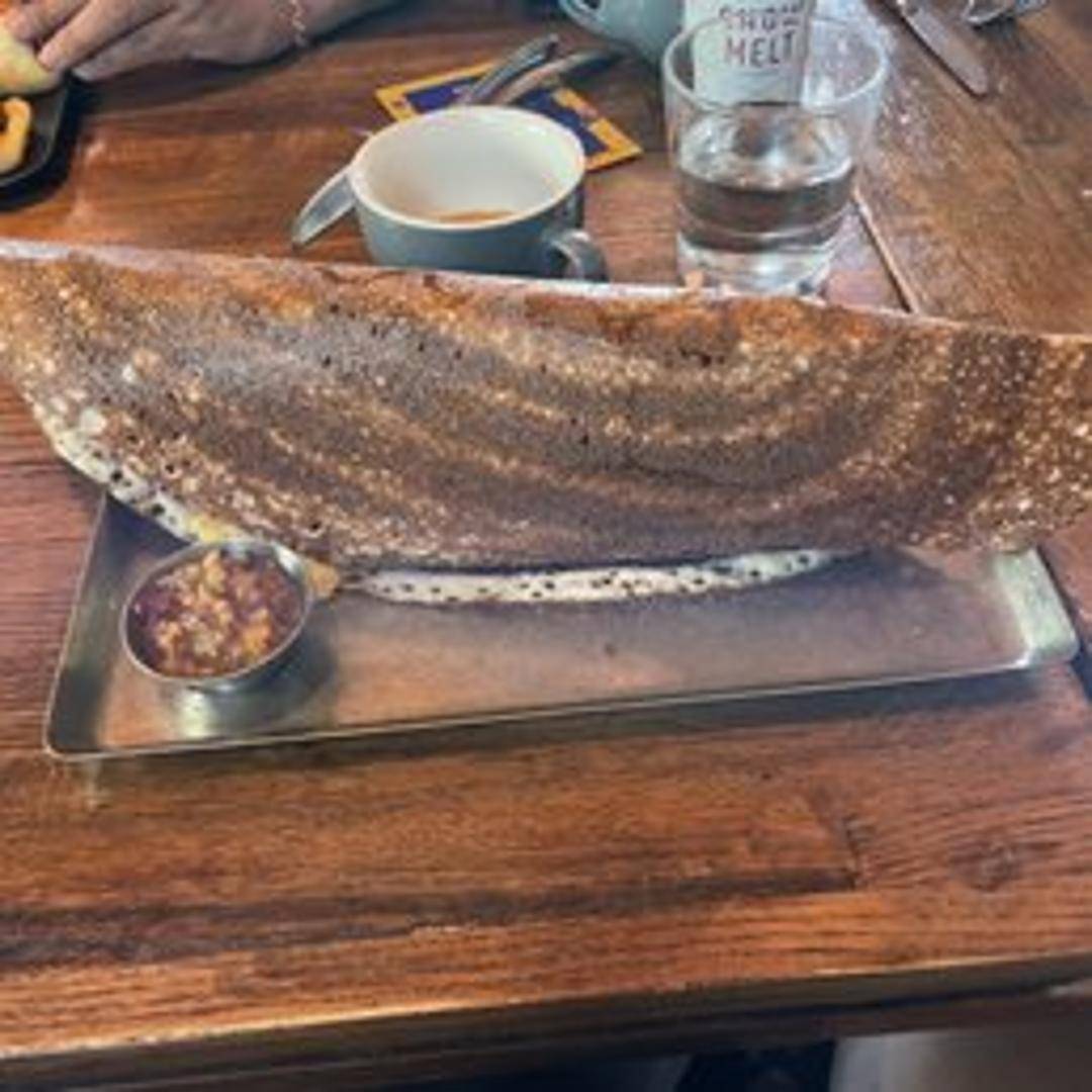 South Indian crepe filled with spiced potatoes and served with coconut chutney and sambar.
