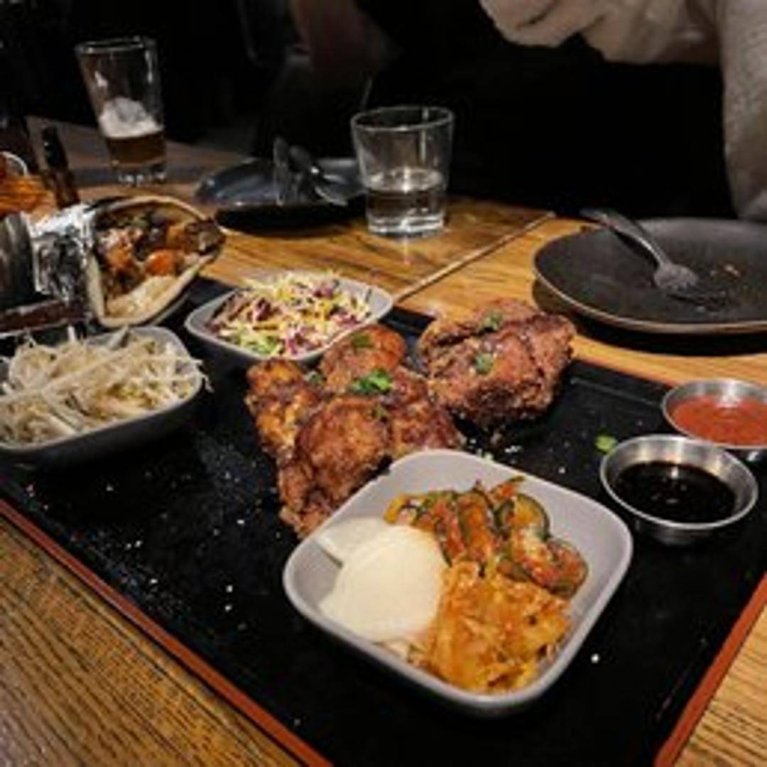 Steamed buns filled with Korean fried chicken, kimchi slaw, and gochujang mayo.
