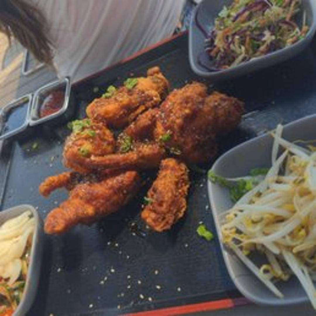 Steamed bao bun filled with crispy fried chicken, pickled vegetables, and a spicy aioli.