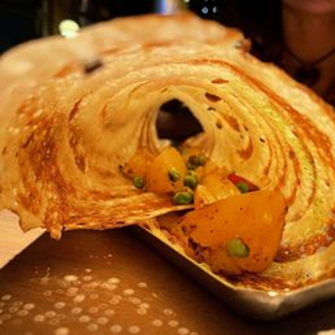 Thin, crispy South Indian crepe filled with spiced potatoes and served with sambar and coconut chutney.