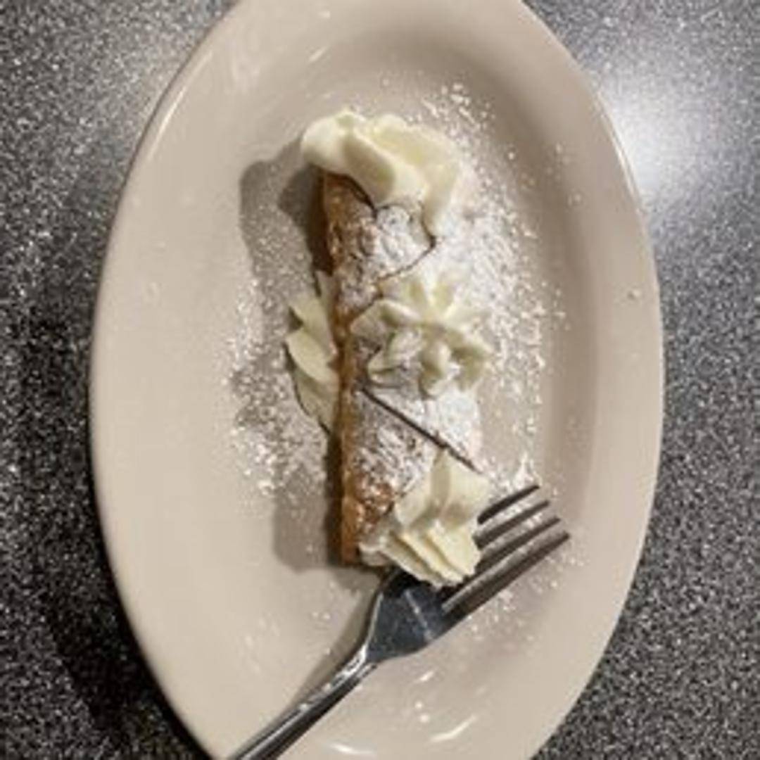 Crispy pastry shell filled with a sweet, creamy ricotta filling, often studded with chocolate chips and dusted with powdered sugar.