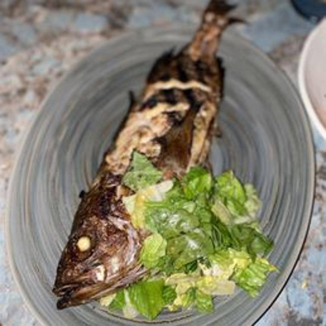 A whole, sustainably sourced fish, prepared using traditional open-fire cooking techniques. The fish is lightly seasoned with local herbs and spices, resulting in a smoky and flavorful dish with crispy skin and tender flesh. Served with a side of seasonal vegetables and a citrus vinaigrette.