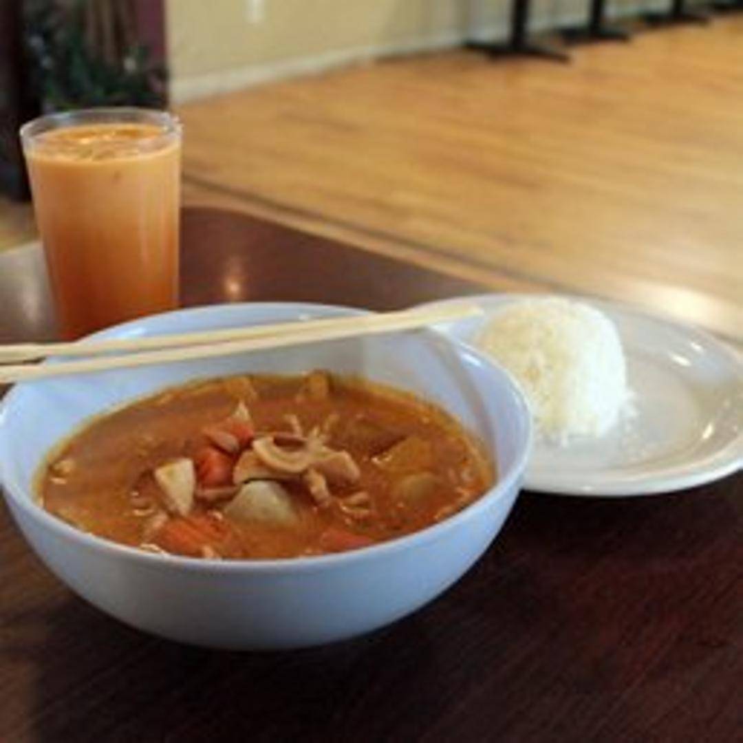 A rich and mildly sweet Thai curry with a complex flavor profile. Typically includes coconut milk, potatoes, onions, peanuts (or cashews), and your choice of protein (chicken, beef, pork, tofu, or vegetables). Features warm spices like cinnamon, cardamom, cloves, and cumin, balanced with a hint of tamarind and fish sauce for a savory depth. Served with steamed rice.