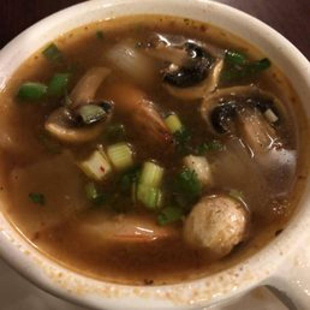 A hot and sour soup with lemongrass, galangal, kaffir lime leaves, mushrooms, tomatoes, onions, and your choice of protein (chicken, shrimp, or tofu). Cooked in a savory broth, seasoned with fish sauce, lime juice, and chili. Garnished with cilantro.