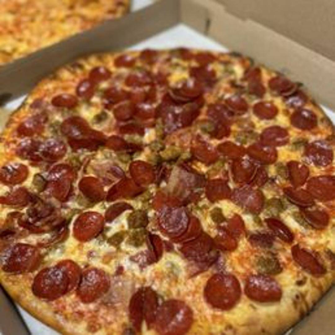 Pizza piled high with generous portions of pepperoni, Italian sausage, crispy bacon, and ground beef over a bed of mozzarella cheese.