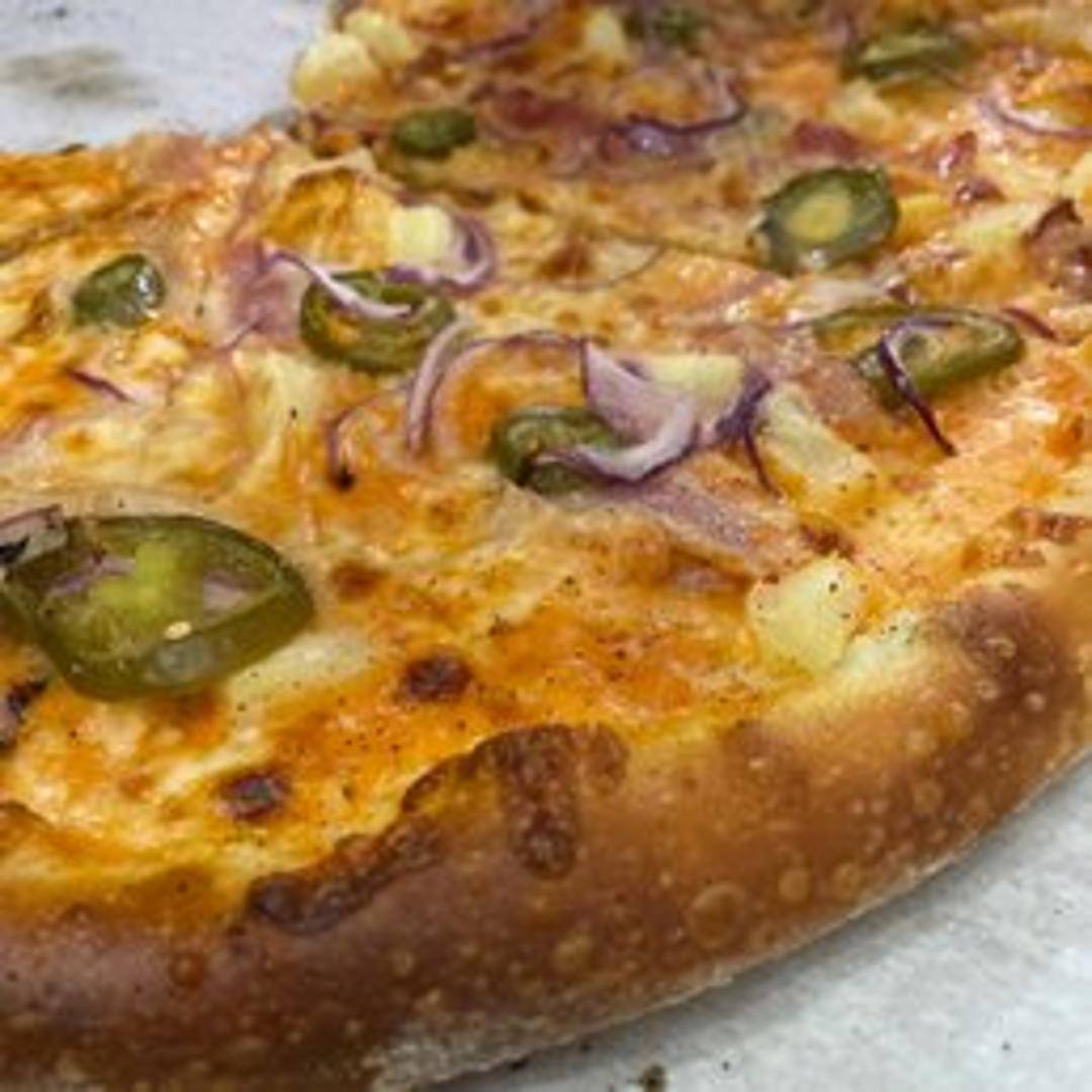 Pizza featuring a blend of mozzarella, provolone and fontina cheeses, smoked ham, chunks of juicy pineapple, and a hint of pickled jalapeño for a sweet and spicy kick.
