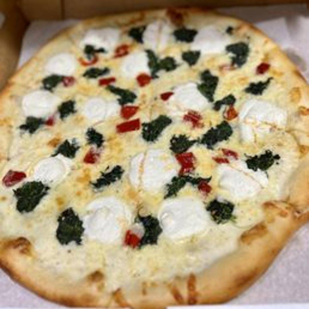 A whole pizza with a ricotta cheese base, topped with mozzarella, provolone, garlic, olive oil, and fresh basil.