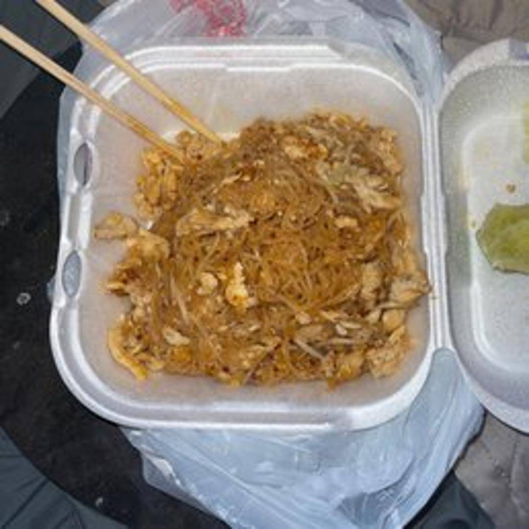 Classic Thai stir-fried rice noodles with shrimp, chicken, tofu, bean sprouts, and egg, tossed in a tangy tamarind sauce and topped with crushed peanuts and lime.