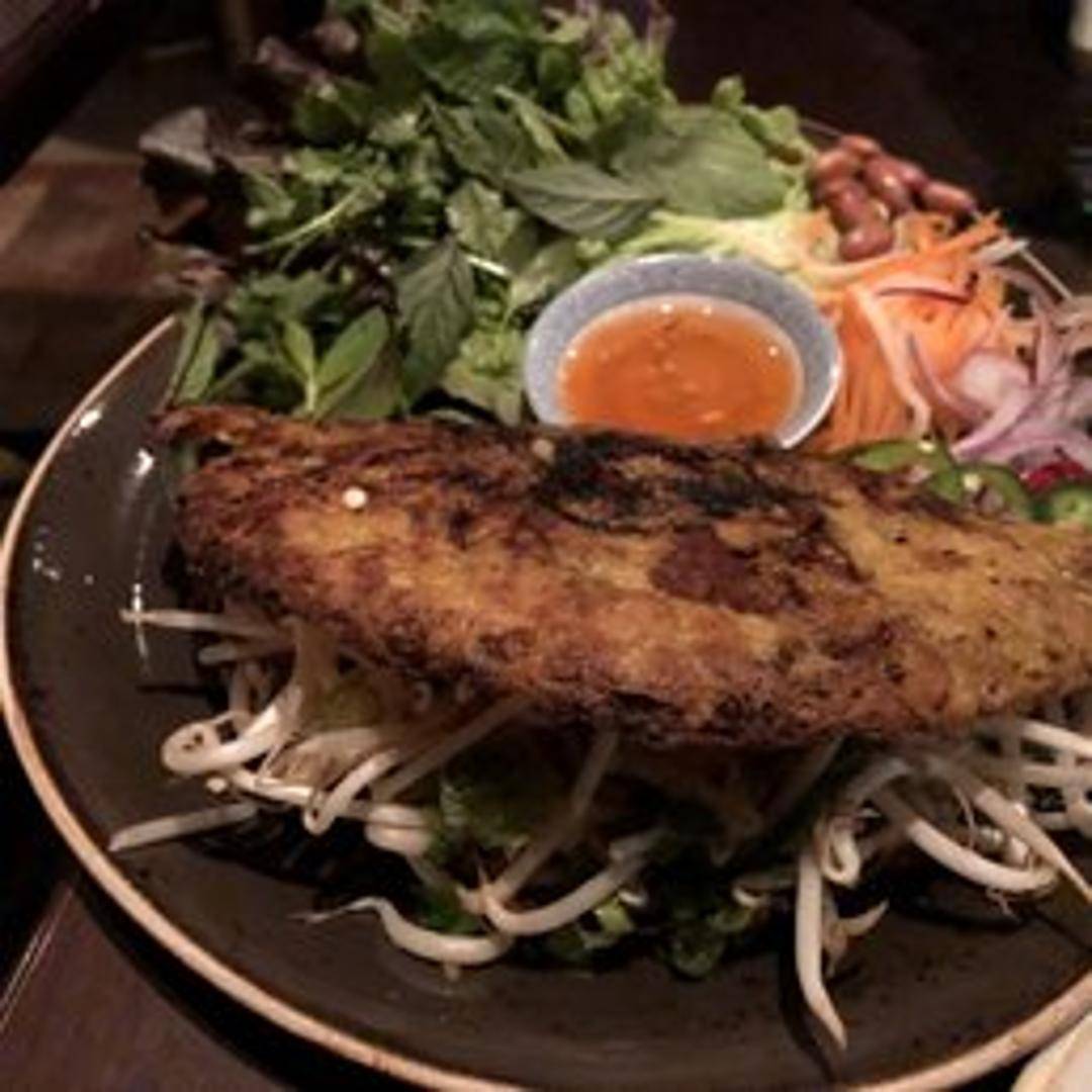 A traditional savory Vietnamese crepe (Bánh Xèo), a thin, crispy turmeric-infused rice flour pancake generously filled with a medley of tender shrimp, thinly sliced pork, crunchy bean sprouts, and finely diced onions. Served with fresh lettuce leaves, an assortment of aromatic herbs, and a side of classic nuoc cham dipping sauce for wrapping and savoring.