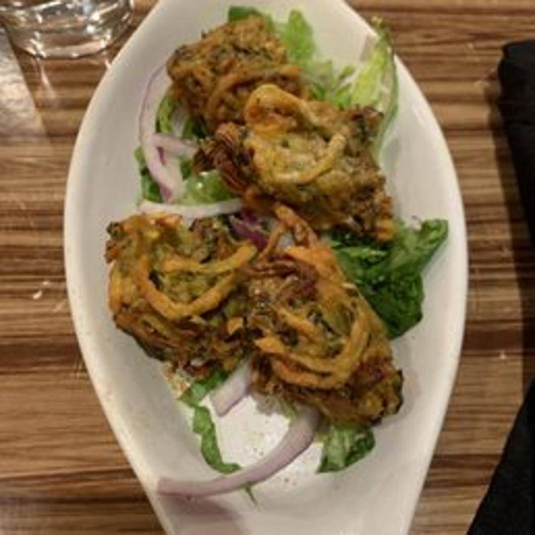 Crispy and golden-brown fritters made from a medley of fresh vegetables like potatoes, cauliflower, spinach, and onions, coated in a spiced gram flour batter and deep-fried. Served with a side of tangy mint-cilantro chutney.