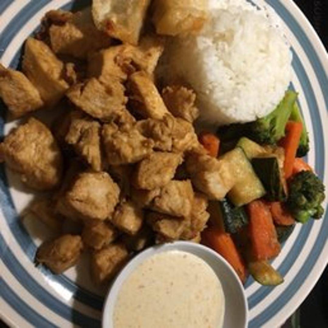Grilled chicken glazed with teriyaki sauce, served with a side of steamed white rice and steamed vegetables. A smaller portion suitable for children.