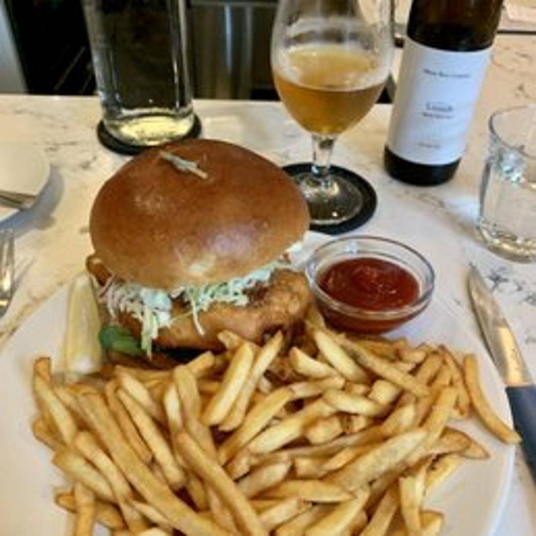 Crispy fried haddock served on a toasted brioche bun with lettuce, tomato, and tartar sauce. A classic sandwich featuring flaky white fish, fresh toppings, and a creamy tartar sauce, all held together by a soft bun.