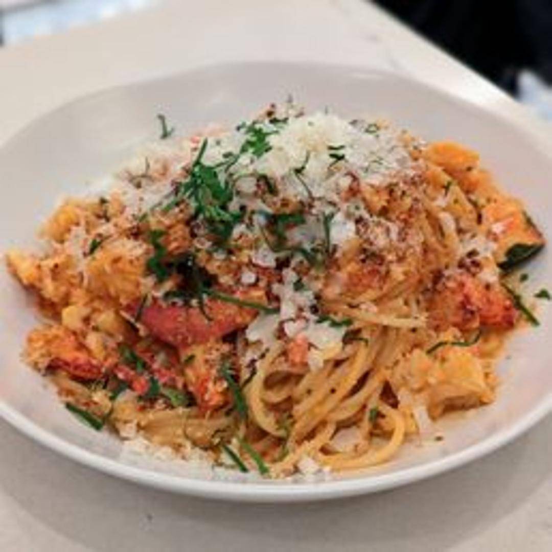Fresh spaghetti tossed with succulent lobster meat, garlic, chili flakes, and a light tomato sauce. A flavorful pasta dish showcasing tender lobster pieces, a subtle spice, and a vibrant tomato base.