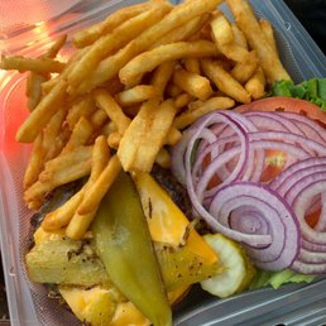 A juicy burger patty topped with melted cheese, a roasted Ortega chile pepper, lettuce, tomato, and your choice of sauce, all served on a toasted bun.