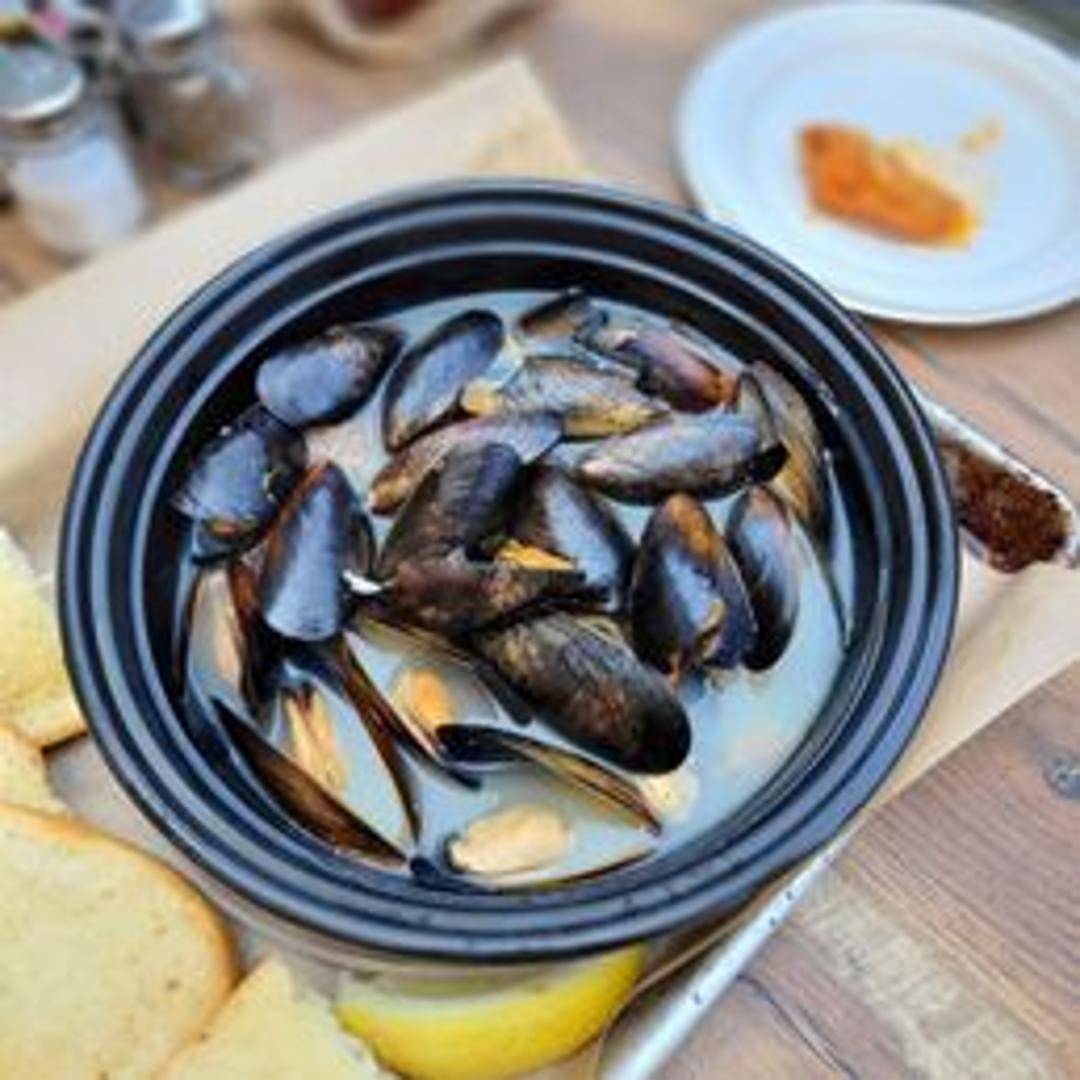 Fresh mussels steamed in a flavorful broth of white wine, garlic, herbs, and butter, served with crusty bread for dipping.
