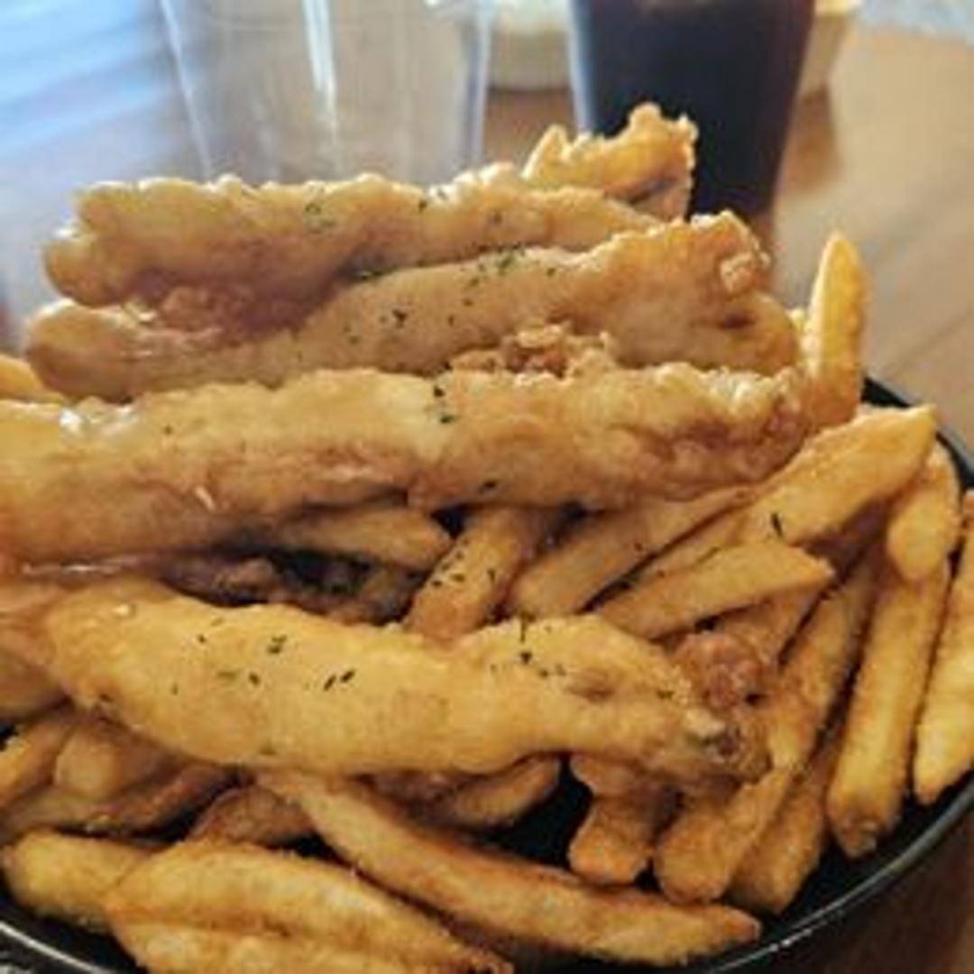 Crispy, battered fish fillets served with golden-fried chips (french fries).