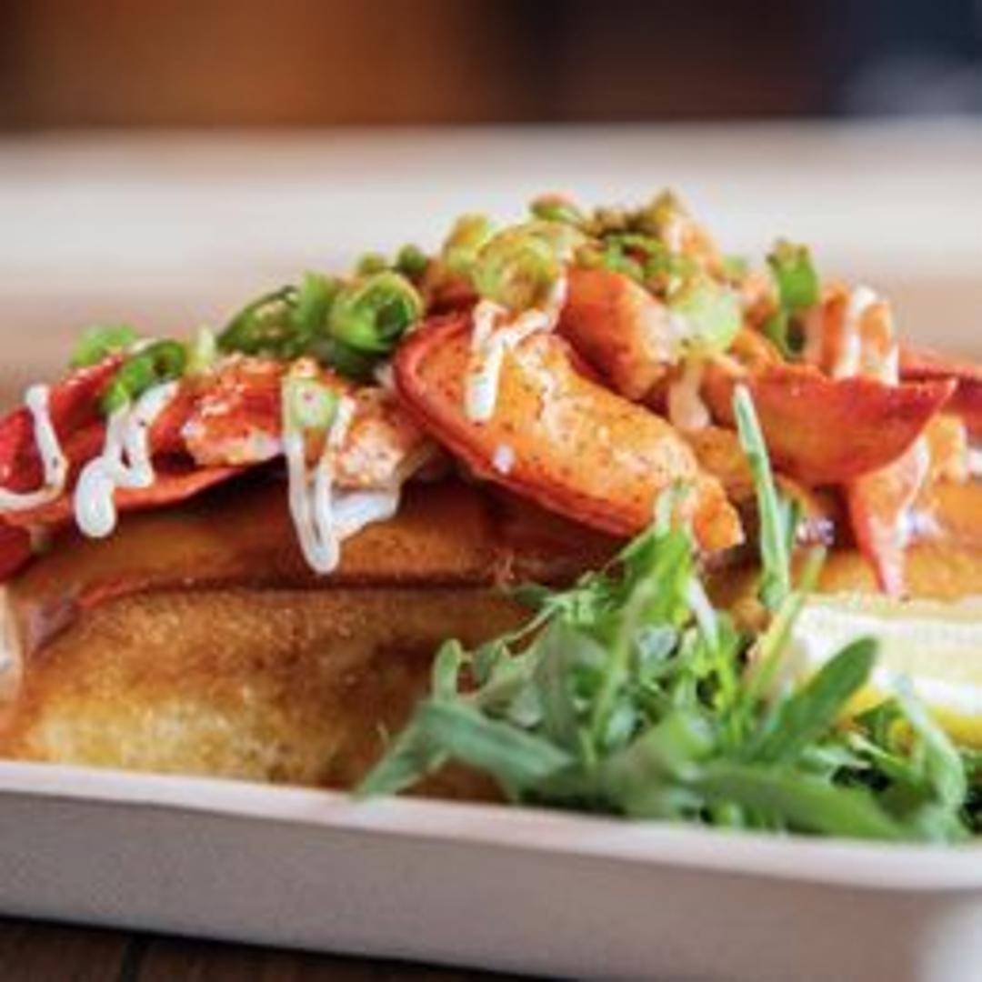 A blend of crab and lobster meat, mixed with mayonnaise and celery, served on a toasted roll.