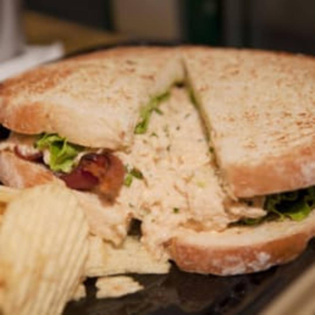 A classic club sandwich featuring generous amounts of fresh, succulent crab meat layered with crisp lettuce, ripe tomato slices, crispy bacon, and mayonnaise on toasted white bread. A truly decadent and satisfying seafood sandwich.