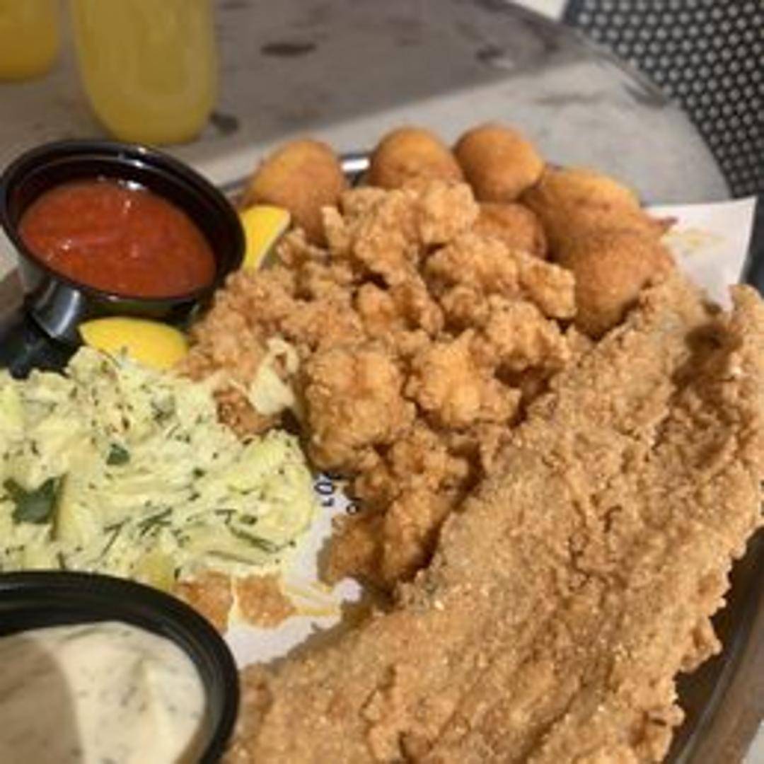 A generous platter featuring lightly battered and fried seafood, typically including shrimp, oysters, and flounder. Served with hushpuppies, coleslaw, and your choice of cocktail or tartar sauce.
