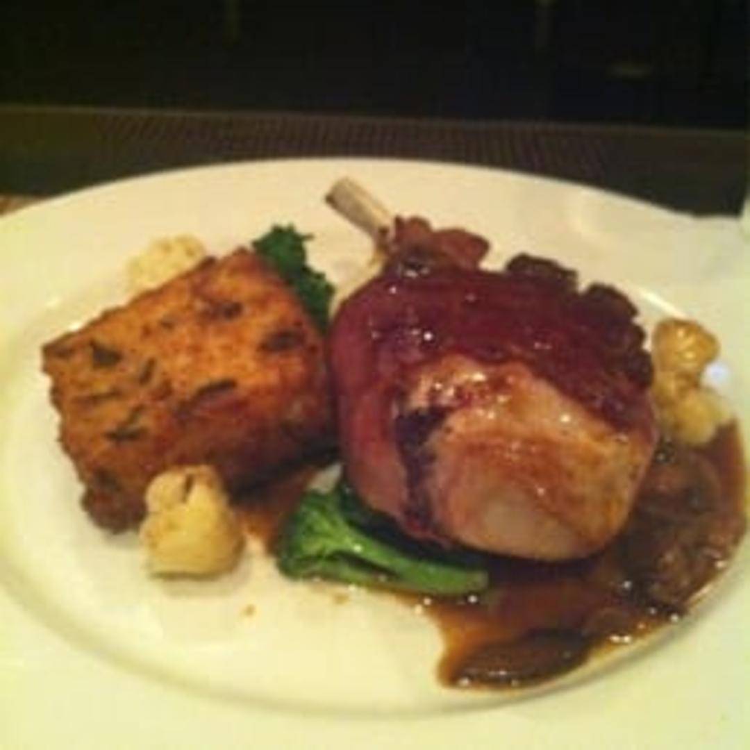 A thick-cut, expertly grilled pork chop, brined to perfection for maximum tenderness and juiciness. Boasting a rich, savory crust and a succulent interior, this flavorful cut is a hearty and satisfying entrée, complemented by chef's seasonal preparations.