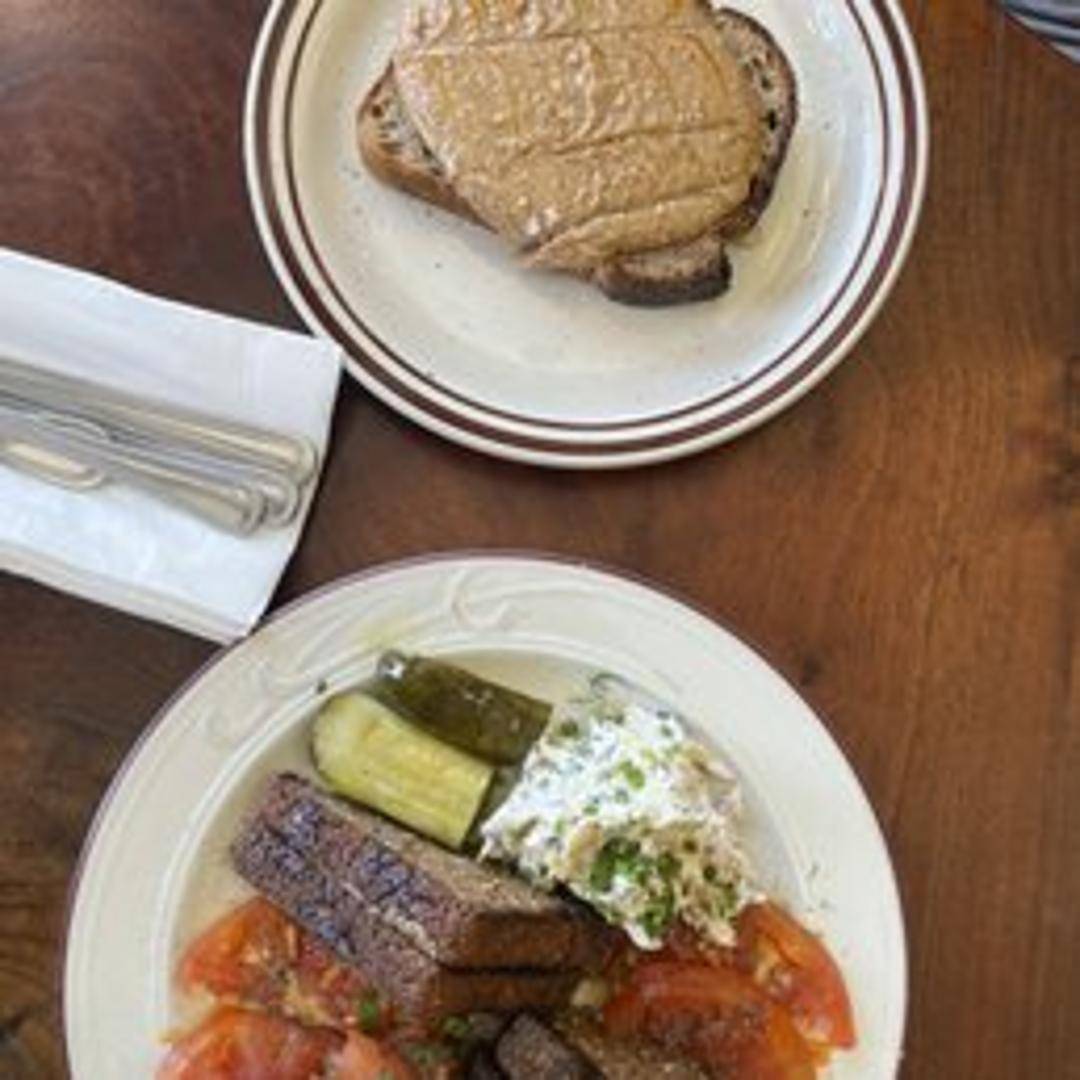 A plate featuring slices of sprouted rye bread served with cured fish, alongside accompaniments like cream cheese, capers, and red onion. Ingredients may vary; inquire about current offerings.