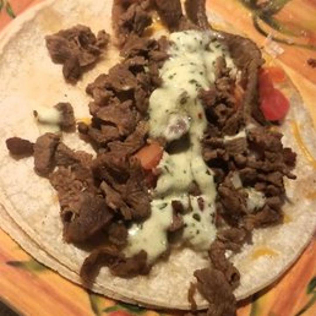 Grilled steak served in a warm corn or flour tortilla, topped with your choice of toppings, including onions, cilantro, salsa, cheese, and lettuce.