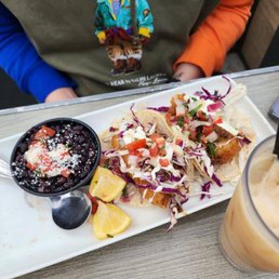 A single Ensenada-style fish taco: lightly battered and fried fish served on a corn tortilla with shredded cabbage, pico de gallo, and a creamy sauce.
