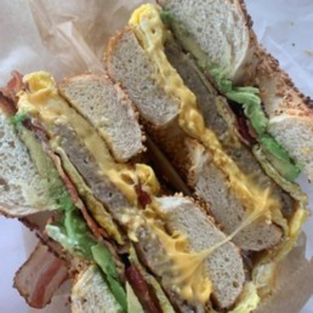 Your choice of bagel topped with scrambled eggs, your choice of cheese, and your choice of breakfast meat (bacon, sausage, or ham).
