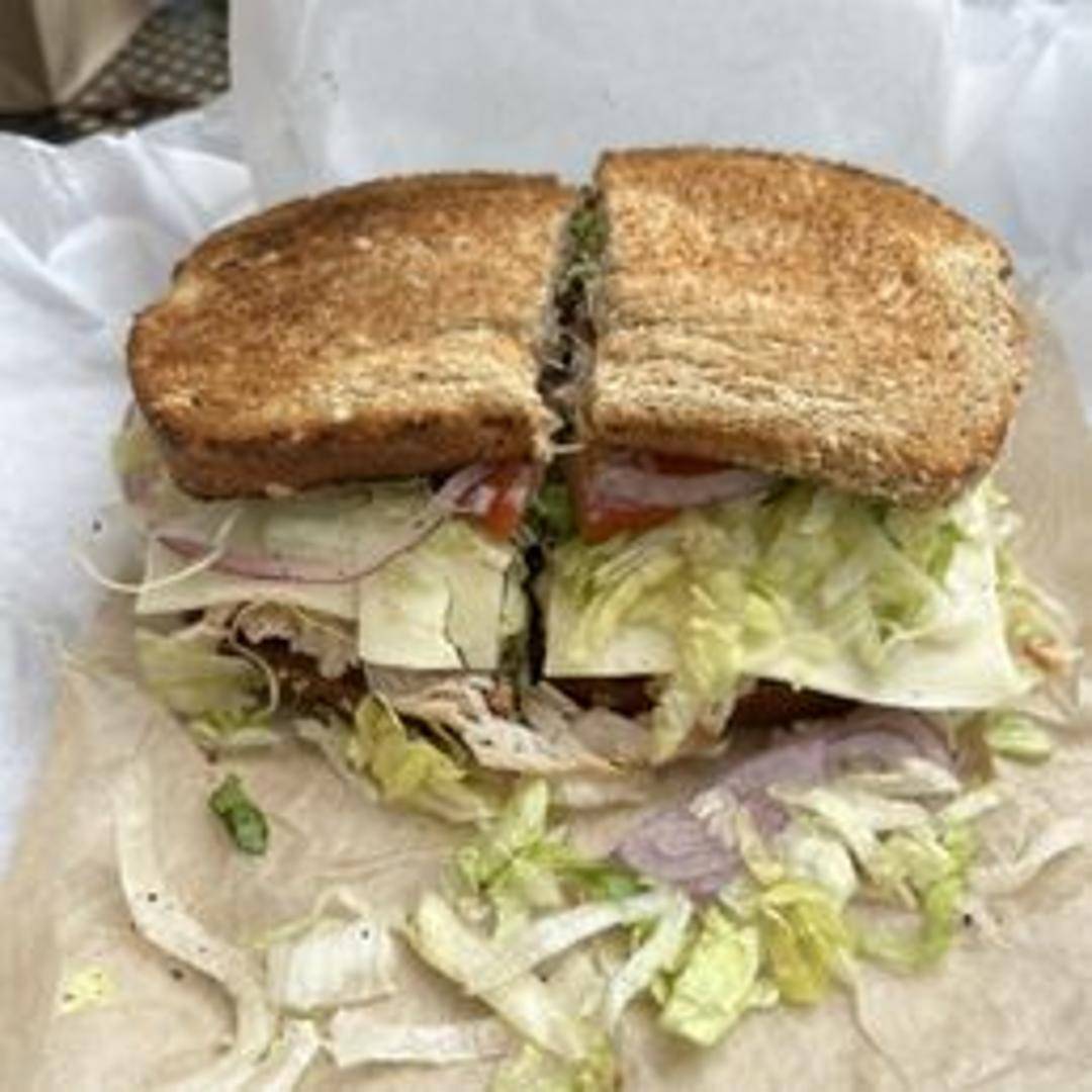 Ham, salami, provolone cheese, lettuce, tomato, onion, oil and vinegar, and Italian seasoning on a hoagie roll.