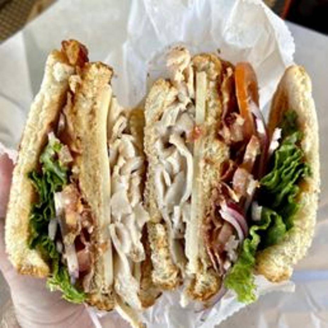 Sliced turkey breast, crisp bacon, lettuce, tomato, cheddar cheese, and mayonnaise on toasted bread.