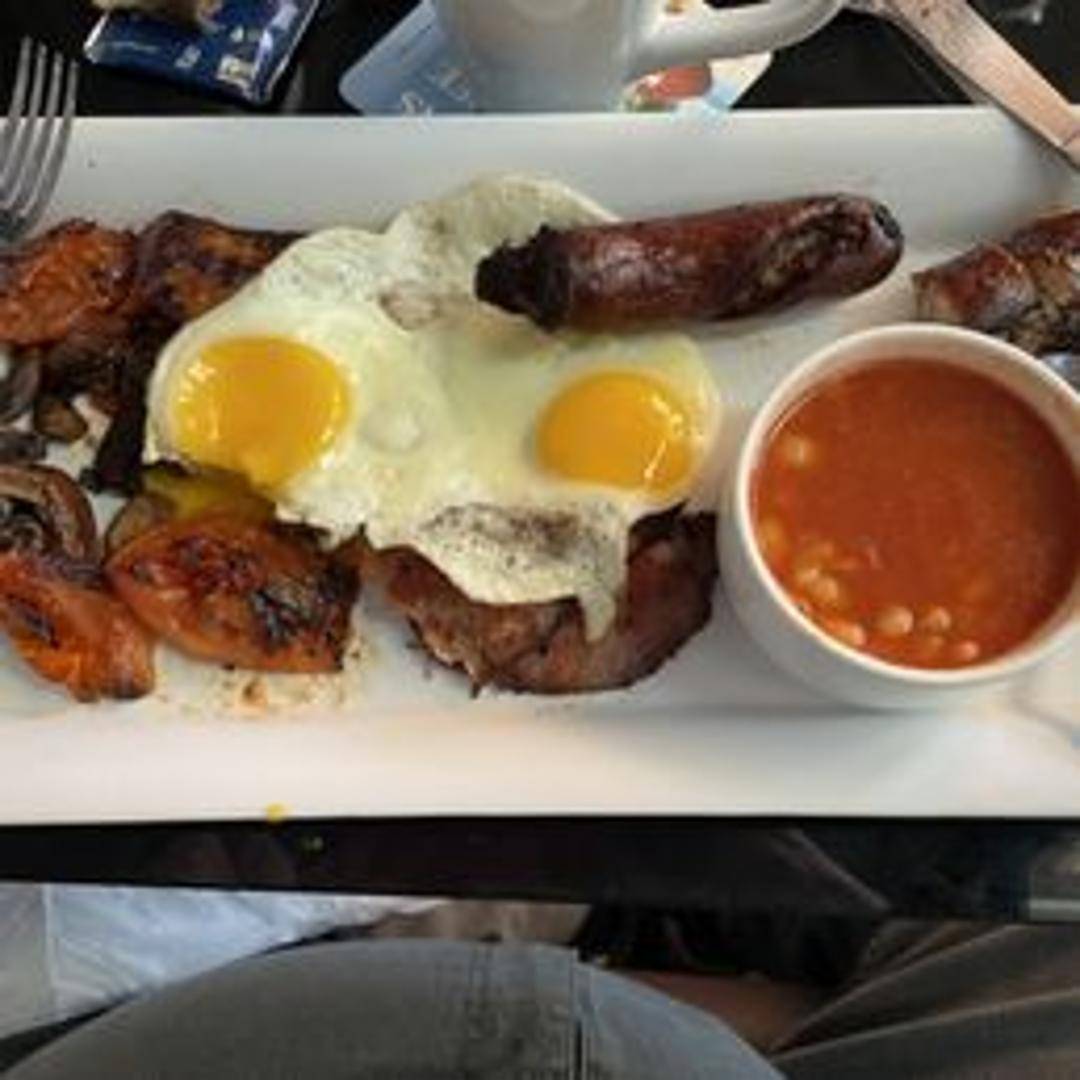 A hearty and satisfying breakfast platter including grilled sausages, crispy bacon, fried eggs, baked beans, grilled tomatoes, sauteed mushrooms, and buttered toast. A true British classic.